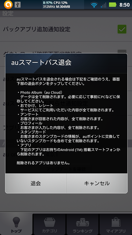 アプリの削除も自動的に行なわれます。警告もなにも無くいきなりってのもアレですが、まあ解約するときに何で?何で退会するの?みたいに色々聞いてこないのは逆にいいことかもしれませんね。