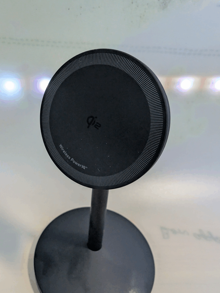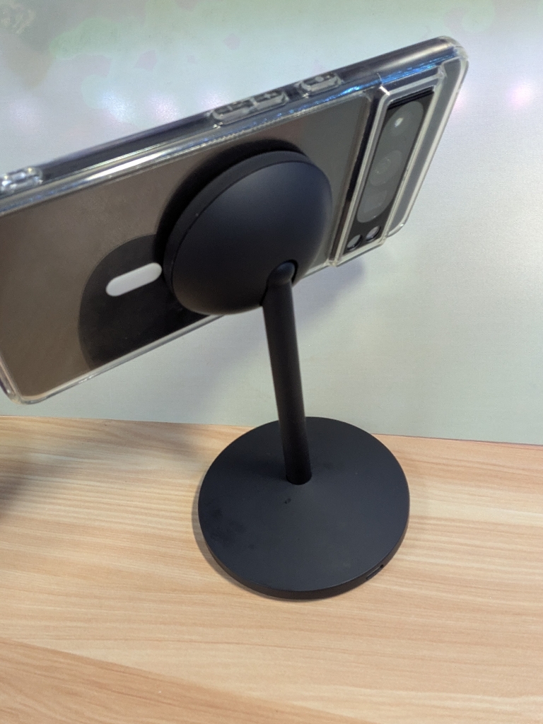 まずはこの充電器です。マグネットでくっついて充電できます。スマホだけではなくてこのように平らにすることもできるので、周辺機器も充電が可能です。私は周辺機器は充電していませんけど。むしろ、もう少し角度を営利にして垂直にもっと近くしてほしいなとは思っています。というのも、これはベッドサイドにおいているんですが、同じくベッドにおいているpcのキーボードをテラスLEDライトとして利用することもあるので、そういった意味であたりを照らしやすい角度だったらいいなという程度です。これはないものねだりだとは思っていますし、寝床でスマホをLEDライト代わりに使うのもどうかと思ってはいます。またこれは、真ん中の丸いところは回るので好きな角度にすることもできます。例えば横置きにして動画を流すもよし、縦に置いて縦動画やネットサーフィンをするもよし、ゲームアプリを起動するもよし。といった感じです。この充電器はQi2に対応していますが、最新の2.1ではないため25w充電には対応していません。最大15w充電となっています。私の持っているPixel 10 Pro XLは2.1対応なのですが、そんなに高速充電が必要か?と言われるとそんな事はないのでこれで十分です。