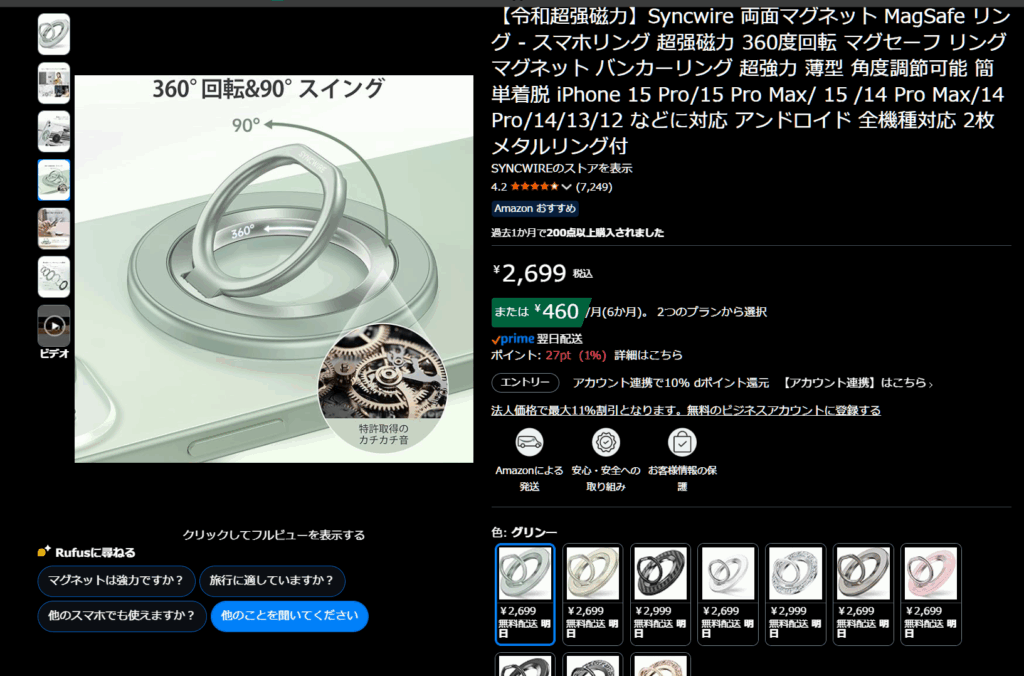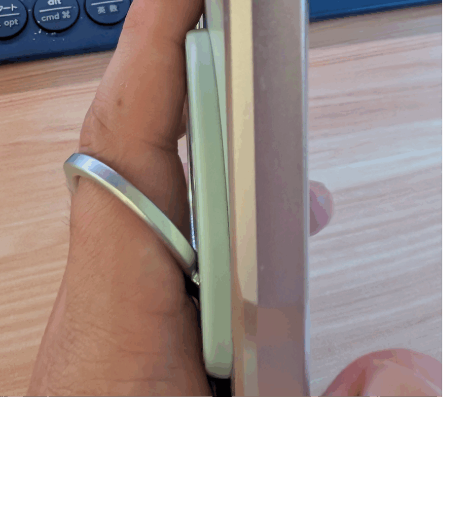 今回購入したのは、先程お話しした通り、Magsafeに対応している磁石で接続するタイプの充電器です。以前に購入したものは、単に立てかけるだけのものでしたが、こちらは外れやすいため、使用中に充電が行われていないことが時折ありました。現在はこの製品に変更してから、充電が行われないという事態は、自分の不手際を除いてなくなりました。この不手際は、二つ目の購入品であるスマホリングやバンカーリングと呼ばれる、かなり以前から存在するもので生じています。かつては磁石ではなく接着剤で固定されたり、ケースと一体型のものが多かったのですが、現在ではケース内に磁石で接続できる板が埋め込まれている製品も存在しています。