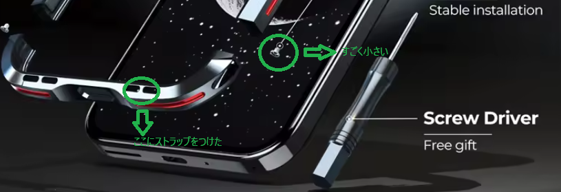 これがその販売サイトでの画像です。右側に小さくスクリューがありますが、これがちょっと甘いというか小さいネジが微妙でして、下部にある穴にストラップをつけました。