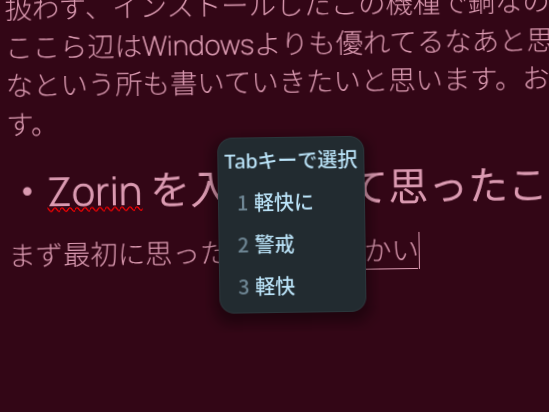 正直windowsでも使いにくいなと感じるのはタッチパッド関連ですね。前回も少し書きましたが、大きいタッチパッドを搭載したノートPCの場合、文字入力中などに手が触れてしまいMousecursorが変なところへ移動して、しかもそこをクリックしてしまって変換中の文字が確定されてしまったり位置が勝手に変わってしまったりとやっぱり使いづらい。この傾向はZorinOSでも変わらず、やっぱり使いにくい。しかもwindowsで動いていたFnキー+ファンクションキーで利用できるショートカットもZorinOSでは利用できないので一時的にオフとかがとかがやりづらい。この辺はもう少しなんとかならないかなあと思います。