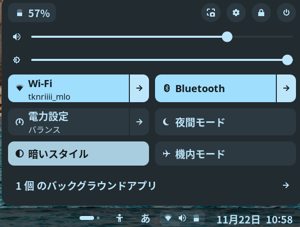 windowsで言うところのタスクトレイ部分がかなりまとまっていていろいろなツールが使えるのは正直いいなと思っています。バッテリーの残量とか音量、Wi-FiやBluetoothなどはwindowsでもありますが、ここからスクショやロック、電源のオフや再起動などもできます。ココらへんはwindowsを真似して使いやすくしたという点なんだと思いますので、こっちのほうが優れているというか、ブラッシュアップされています。windowsはOSのメジャーバージョンを挙げない限りこのあたりを変更することがなかなか難しいようなので、いい点があれば取り入れてほしいなと思います。