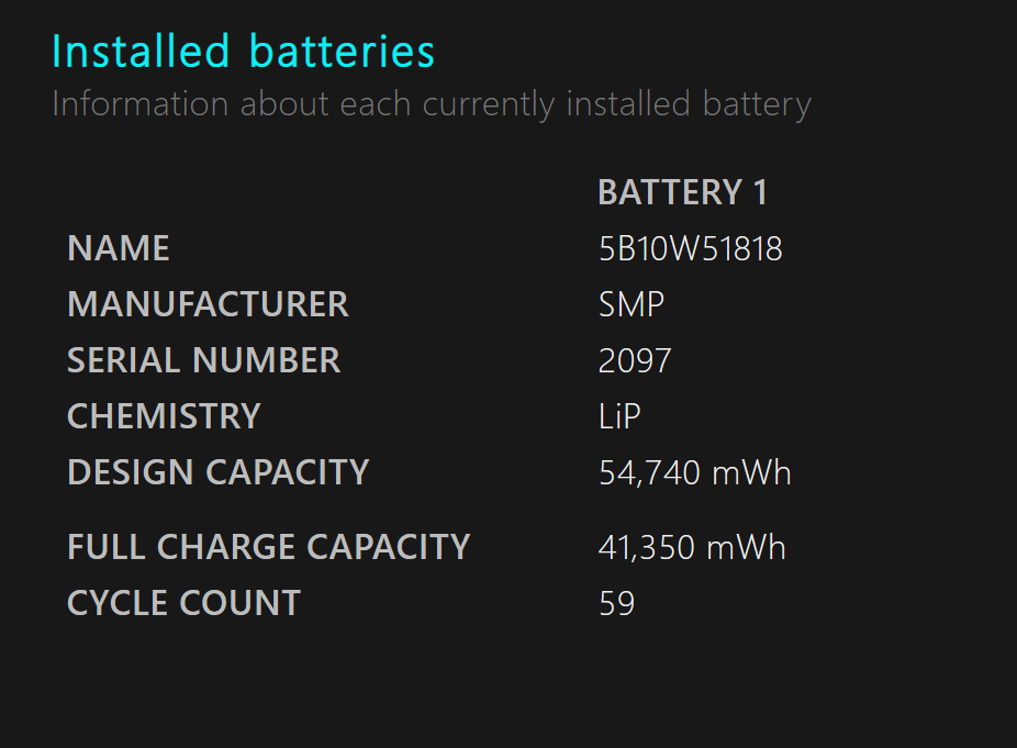 大体75%位の残量ですね。この個体の正式な出荷日はわかりませんが、2021年8月~11月ごろに市場に出ていたようなので、おおよそ4年落ちとなります。なので、このバッテリーは順当と言えるかもしれません。ただ、綺麗だったのでそれほどハードに使われていなくてもこれくらい減るのかなとかも思ったりしました。おそらく企業から一気に下取りに出た物をクリーニングなどをして販売していると思われるので、おそらく電源さしっぱなしで利用されていたんだろうなとは思います。サイクルカウントが59程度のため、かなり少なめに思えるためです。本来持ち運びに有利な小型PCですが、こういうこともあるんでしょうね。私が会社から渡されているのも同じ13インチ級のノートパソコンですが、外出先にゴリゴリ持って行っていますからここまで少ないサイクルではないと思います。