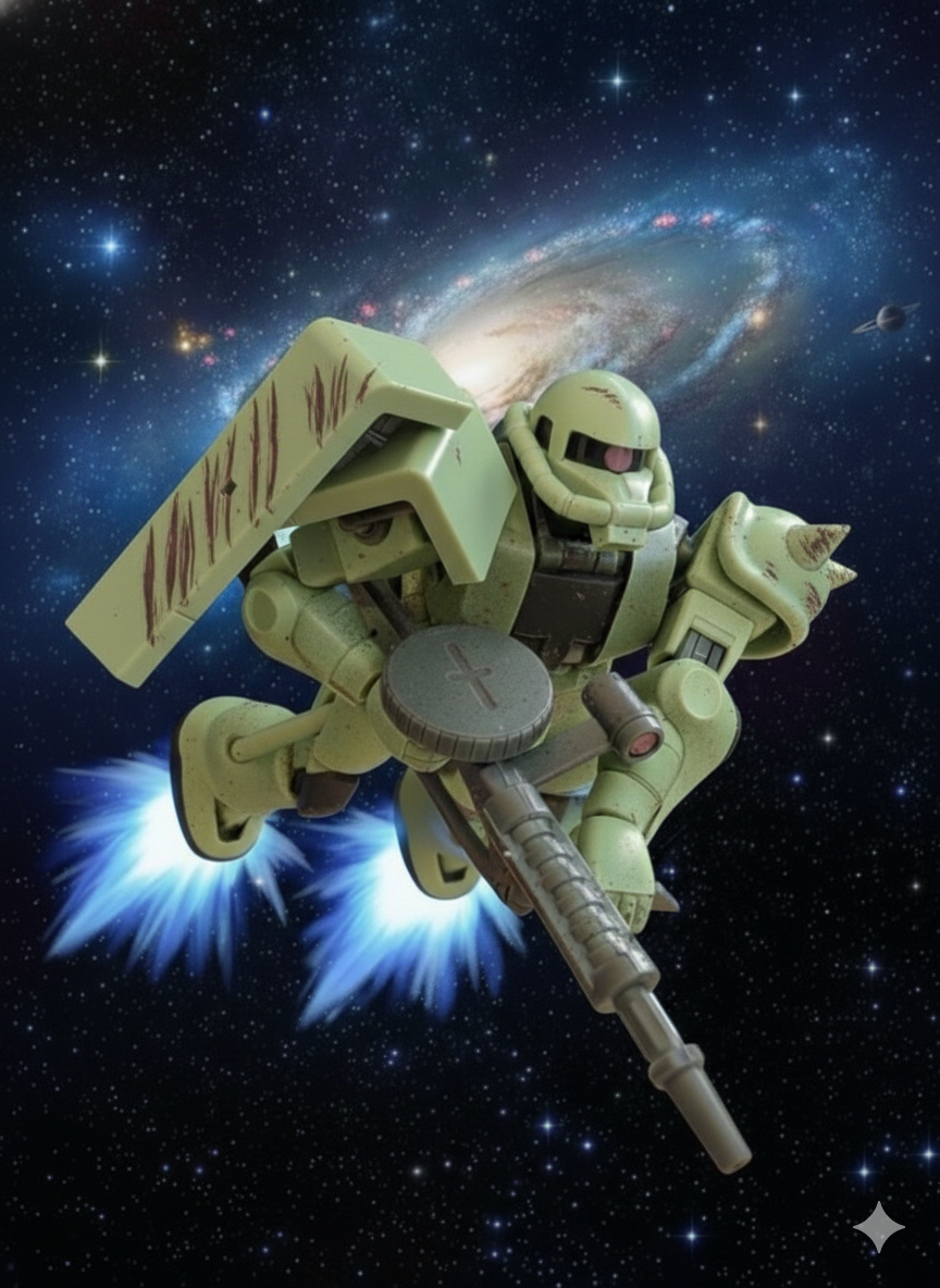 特殊加工はほぼせずに単に宇宙を飛んで足の裏からブースターのエフェクトを追加という程度で作りました。ガンダムの初期オープニングの最初に近い感じになりますね。これを加工すれば編隊にもできますし、昔と違って楽にこういう画像が撮れるのはいいですね。
