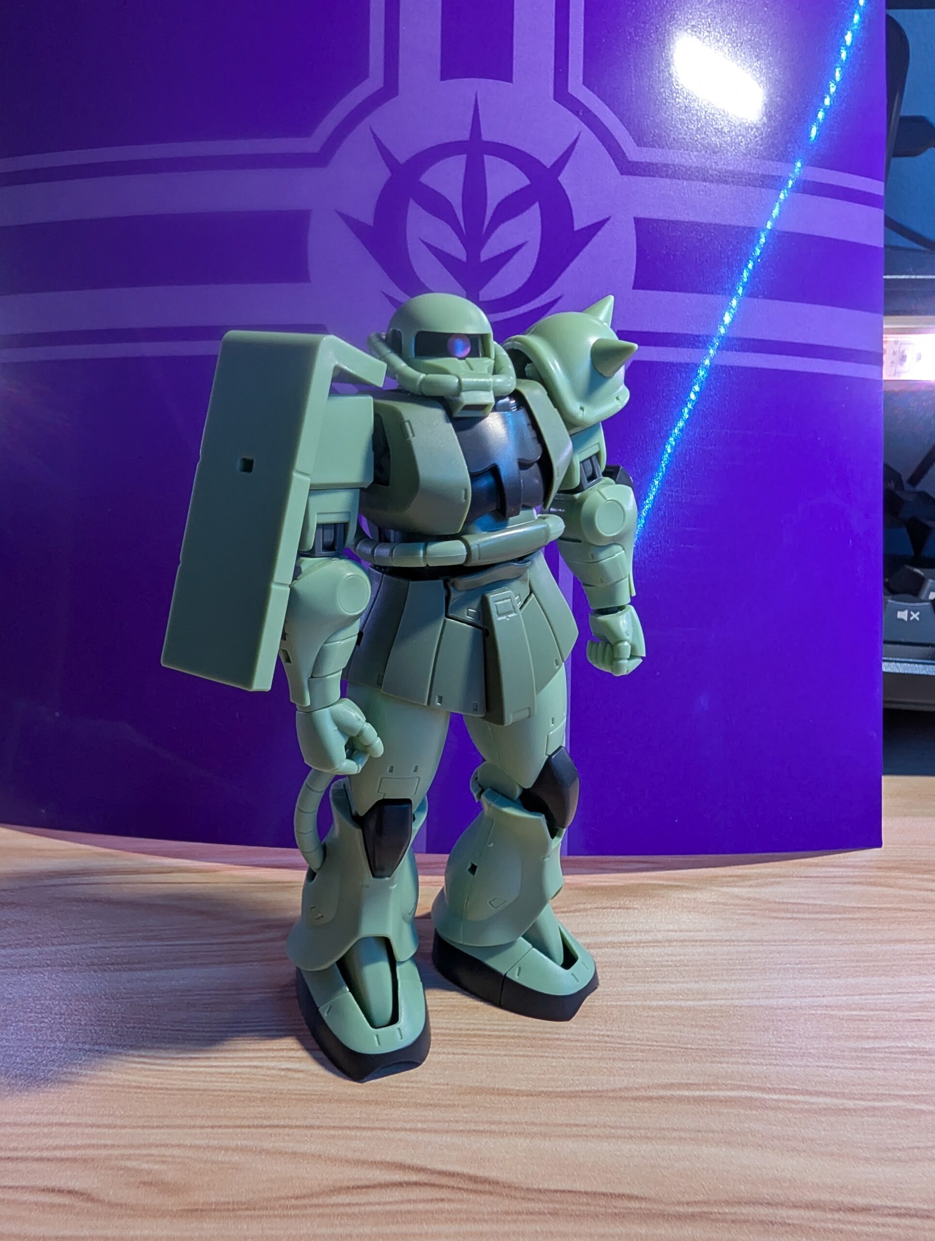 この無骨なフォルム、いいですね。奇をてらわない量産型というのもいいです。背後のジオンのロゴの入った紙もキットに入ってたヤツです。ジオンの旗の下にって感じですね。性能ではなくこの無骨な格好と色、いかにもという感じで大好きです。