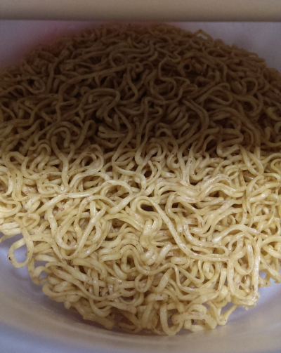 よく見てみると、細かい粒が入っている。これが全粒粉の証だろう。油揚げ麺は歴史上では偉大だが、今ではノンフライ麺でそれ以上のうまさが出せることから、ノンフライ麺がうまくてカロリーも低い。私は本当にまた食べたいな、と思うカップ麺だった。スーパーなら少し安く売ってるのかな?見てみようっと。