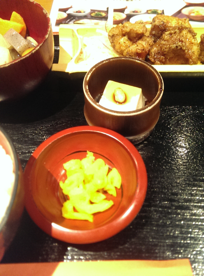 奥に見えるのがチキン南蛮。真ん中は副菜のごま豆腐。他に煮物もついています。